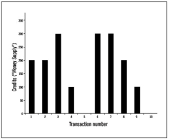 It can be seen from Figure 11.4 that the “money supply” need not be an ever-increasing number, as it is in the political money system. Note how the money supply fluctuates up and down, increasing as participants draw upon their prearranged credit lines to make purchases, and decreasing as existing credit balances are spent, at which point those credits no longer exist. Clearly, the quantity of money in a credit clearing system is self-adjusting in accordance with the trading needs of the associated members and does not play the same role as in a commodity money system where the money supply is relatively inflexible, nor in the political debt-money system in which credit is centrally controlled and much of the money is created by fiat on an improper basis.