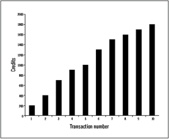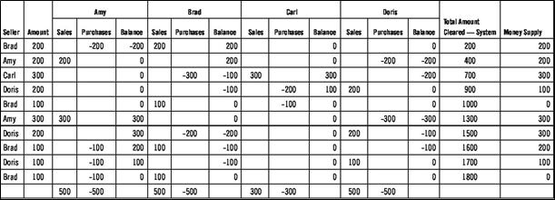 To show how direct credit clearing between buyers and sellers works, it will be helpful to examine an example involving a small set of transactions among only a few participants. It should be carefully examined. Table 11.1 shows ten hypothetical transactions among four participating traders. As each transaction is processed and posted to the ledger, the second to last column shows the cumulative amount cleared, which is shown graphically in Figure 11.3. The final column shows total amount of credits outstanding at each point in time, which can be thought of as the internal “money supply.” This is shown graphically in Figure 11.4.