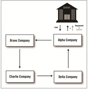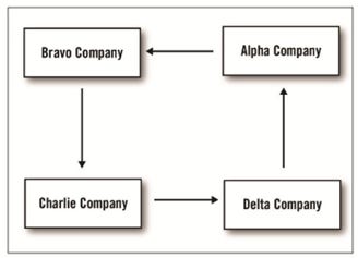But these companies can pay one another using their own credit without the involvement of a bank, which is portrayed in Figure 11.2. As in the previous scenario, each owes an amount to another. But now, suppose Bravo is willing to accept Alpha’s self-issued credit instrument (IOU) in payment, and each of the other companies in turn is also willing to accept Alpha’s IOU. Alpha Company writes an IOU and uses it to pay Bravo, Bravo then passes Alpha’s IOU on to Charlie in payment for what it owes, then Charlie passes it on to Delta to pay its debt, and Delta finally returns Alpha’s IOU to Alpha in payment for its debt. Now all debts have been paid, no money was borrowed, and no interest needed to be paid.